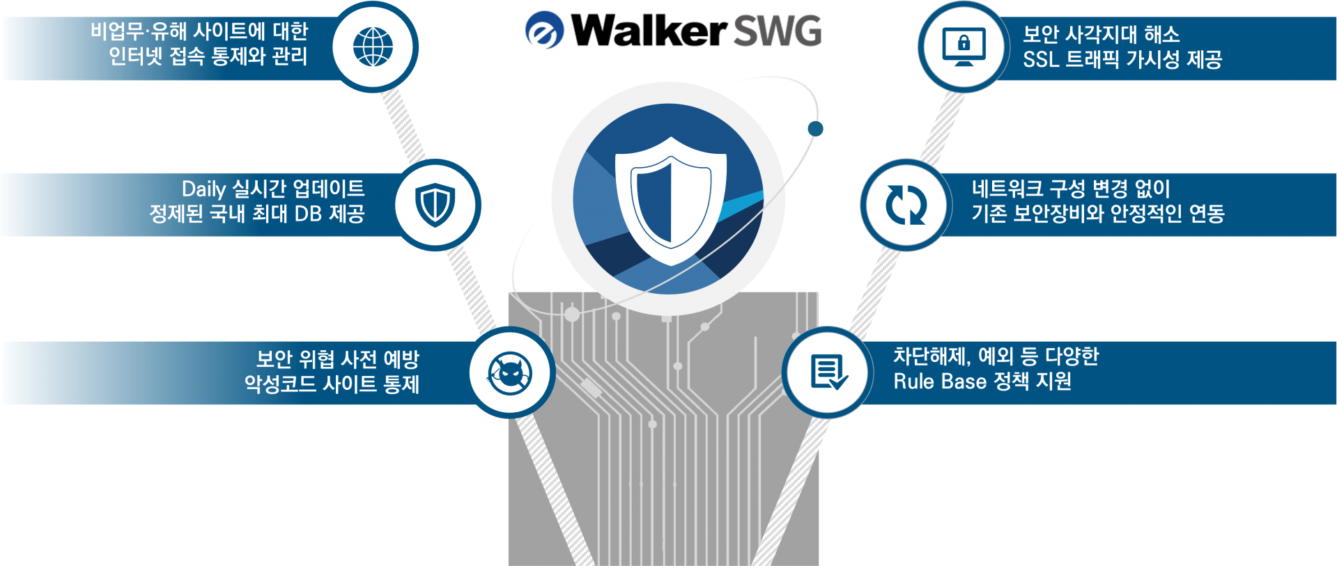 사용자 인터넷을 효과적으로 통제하여 업무 효율성을 높이고, 비업무·유해 사이트DB를 제공하여 보안 위협을 예방합니다.